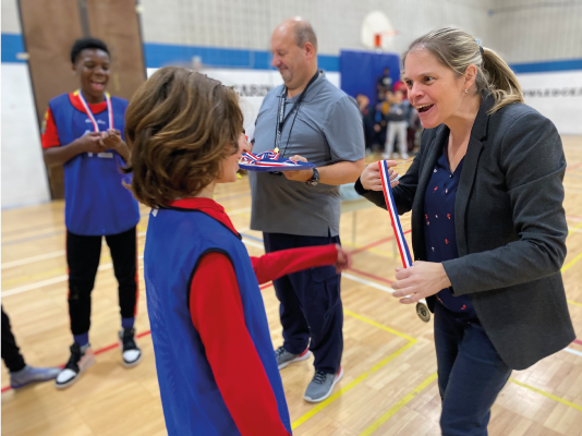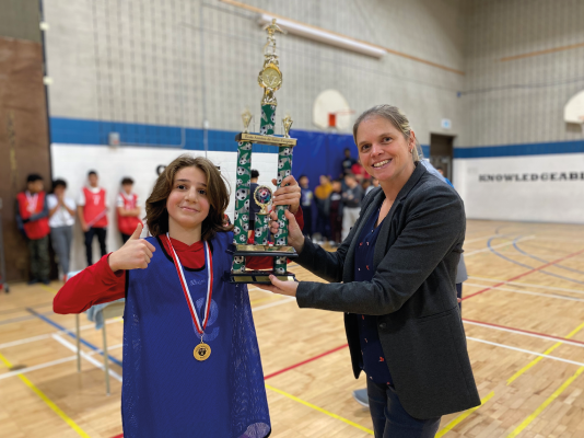 Madame Kathy Wilkinson, directrice adjointe de la première secondaire. remet le trophée au capitaine de l'équipe gagnante.